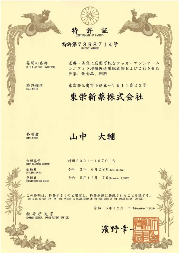 東栄新薬株式会社(所在地:東京都三鷹市、代表取締役:元井 章智)は、東京薬科大学薬学部免疫学教室と共同で行った、当社の露地栽培アガリクスKA21株(以下、アガリクスKA21)に関する研究成果として、アガリクスKA21摂取によるアッカーマンシア菌(Akkermansia muciniphila)の増殖促進作用を確認しました。今回、この研究成果を受けて「医療・美容に応用可能なアッカーマンシア・ムシニフィラ増殖促進用組成物およびこれを含む医薬、飲食品、飼料」として特許登録が行われましたことをご報告いたします。
