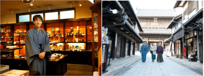 天保元年(1830)に陶器商として創業し、現在も国内外の多彩な器を取り扱う「かわ重」の6代目が長浜の街をご案内。