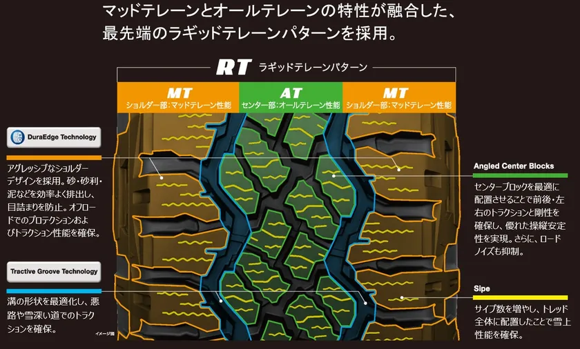 今回発売する「WRANGLER DURATRAC RT」は、マッドテレーンタイヤのようなワイルドな顔つきでありながらオンロード・オフロードを問わない幅広い性能を持ち、街乗りや山道・泥道を駆け抜けるアクティブな4×4・SUVユーザーに最適です。