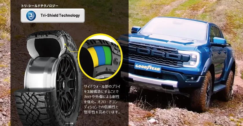 サイドウォール部の3層構造により耐外傷性が強化され、オフロードでのアグレッシブな走りを実現。