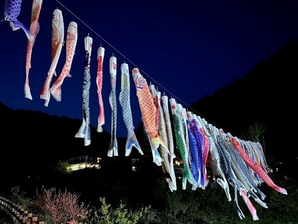 板室温泉では、4月15日から色とりどりの鯉のぼりが掲揚され、新緑の季節の訪れを告げます。さらに、ゴールデンウィークの4日間限定で、今年で4回目となる「鯉のぼりライトアップ」が開催されます。