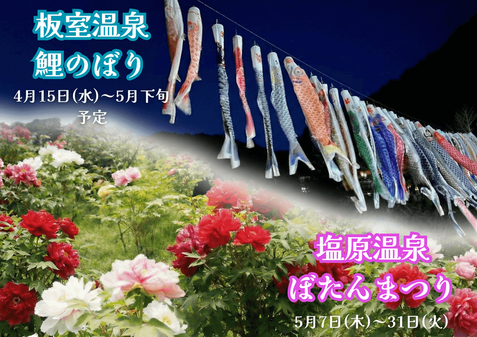 一般社団法人那須塩原市観光局(栃木県那須塩原市関谷448-4、局長:織田智富)は、初夏の風物詩「板室温泉 鯉のぼり」及び「塩原温泉 ぼたんまつり」の開催をお知らせいたします。
