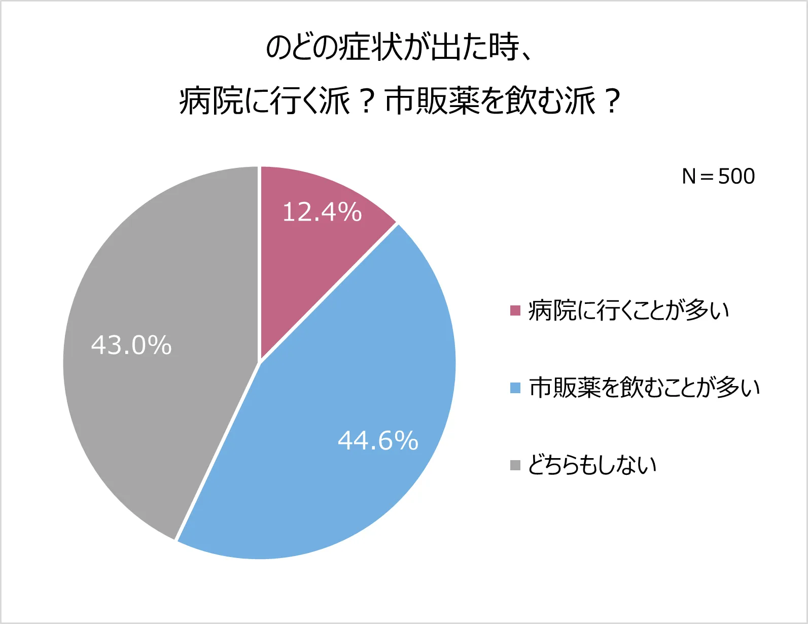 まず、のどの症状が出た時の対応について聞くと、「市販薬を飲むことが多い(44.6%)」、「どちらもしない(43.0%)」という回答がそれぞれ4割以上で、「病院に行くことが多い(12.4%)」という回答を上回る結果に。病院に行くよりも、市販薬で済ます人が多数派ということが分かりました。