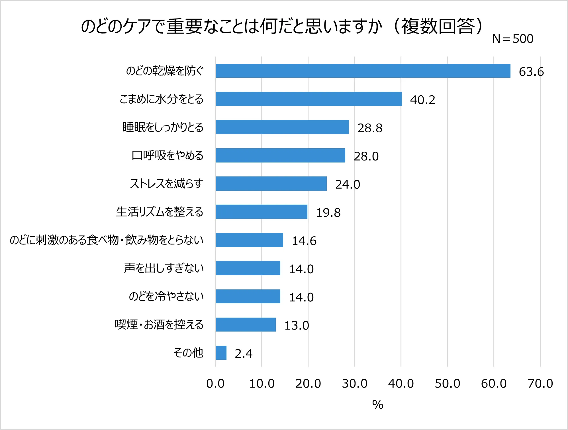 のどケアで重要だと思うことを聞いた質問では、特に「のどの乾燥を防ぐ(63.6%)」、「こまめに水分をとる(40.2%)」ことが大切だと認識している人が多くいました。