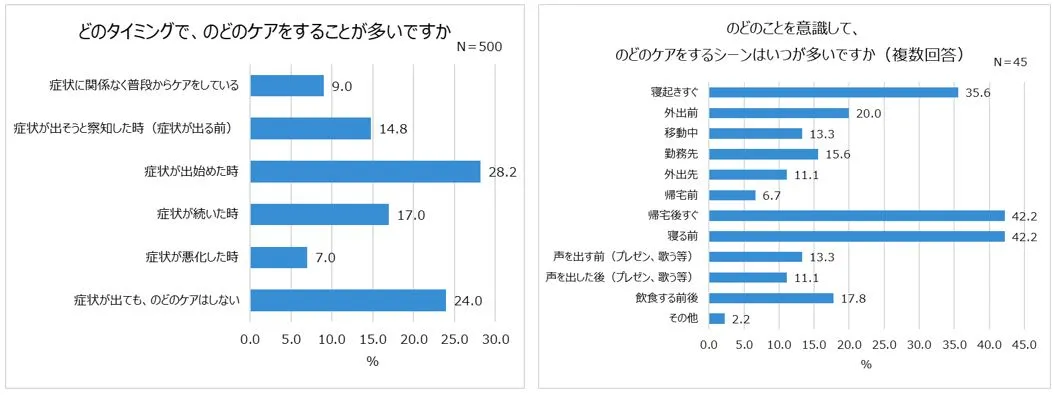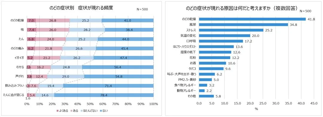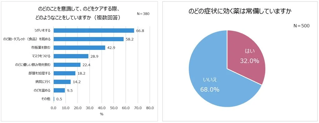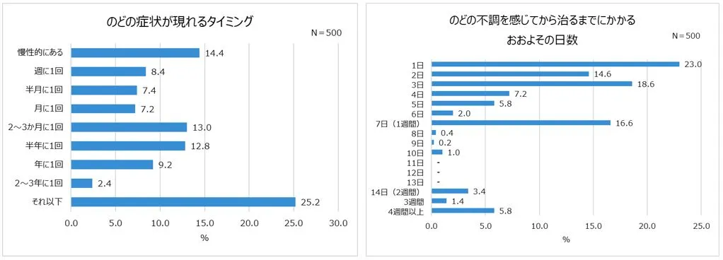 調査から、月に1回以上のどの症状が出る人が約4割と、高頻度でのどの症状が出る人が多数おり、症状が7日以上長引く人が約3割もいることが判明。一方で、日常的にケアしている人は少なく、症状が出てから市販薬を頼りにする人が多いことが明らかになりました。