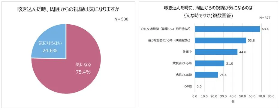 また、咳き込んだ時に周囲からの視線が気になるかを調べたところ、「気になる(75.4%)」と答えた人は7割以上もいました。「仕事中(44.8%)」のほかに、「公共交通機関(68.4%)」や映画館など「静かな空間にいる時(53.8%)」に、気になる人が多いようです。