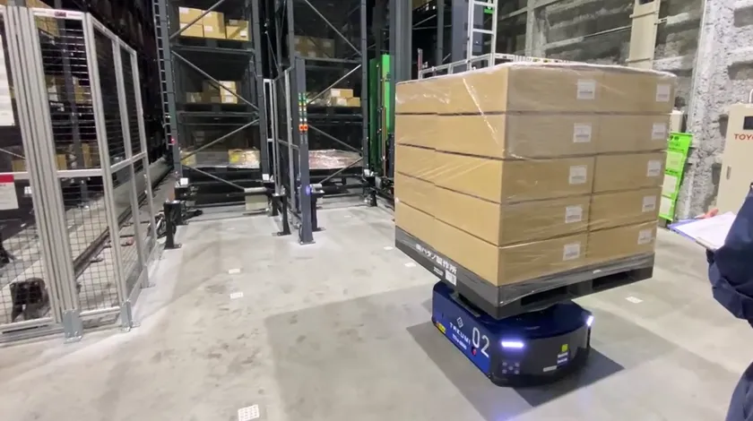グリッド式AGV(無人搬送車)「TiTra G500」を使った 自動倉庫連携によるパレットの自動搬送システムを ハタノ製作所へ納入