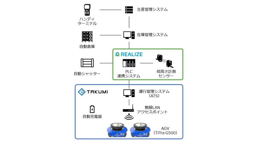 今回、ハタノ製作所の倉庫1階に、匠のグリッド式AGV(無人搬送車)の「TiTra G500」を2台納入しました。「TiTra G500」は、搬送重量500kgまで対応可能なリフト型AGVで、REALIZEが製造しております。また、入出庫指示、生産管理システム、自動倉庫、自動シャッター、荷高さ計測センサー、「TiTra G500」の運行管理システム(ATS)などの連携を行うためのPLC連携システムをREALIZEが設計・開発しました。