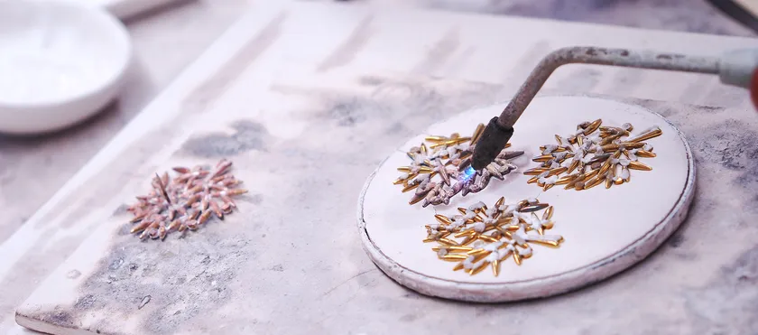 単純なひとつひとつのパーツやツメ(クリスタルを留める土台)を寄せ集め、それらをろう付けと呼ばれる溶接で、様々な形のジュエリーに作り上げる技術です。