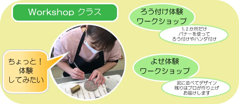 陶芸の里のように、一部の作業だけを行い、後日、プロの手で仕上げてから製品としてお届けする、国内、海外旅行者にも対応する観光を目的とした「よせ」体験ワークショップ。