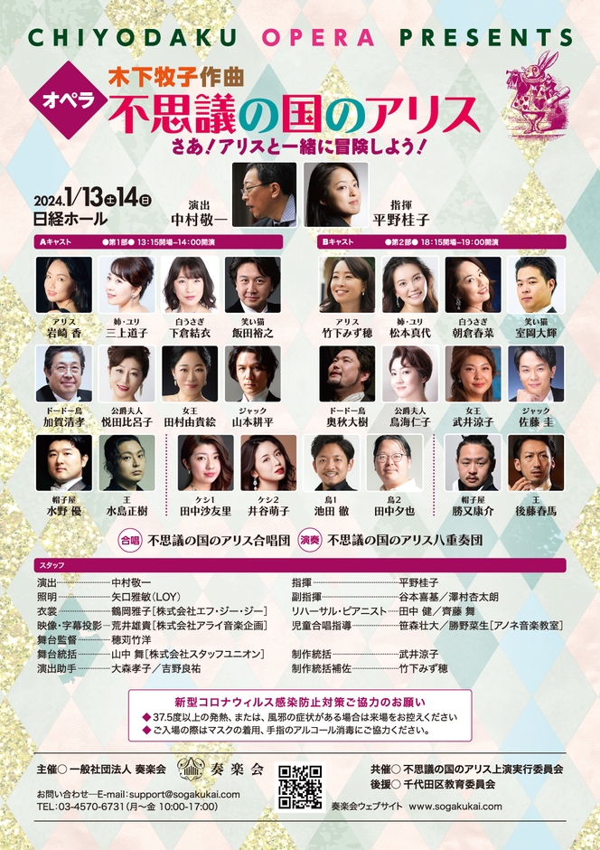 不思議の国のアリス上演実行委員会(東京都千代田区、委員長:吉峯裕毅)および一般社団法人奏楽会(同区、代表理事:三浦義孝)主催、千代田区オペラ木下牧子作曲『不思議の国のアリス』が2024年1月13日 (土) ~2024年1月14日 (日)に日経ホール(東京都東京都千代田区大手町1-3-7)にて上演されます。