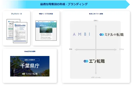 プレスリリースや特設ページ、Web広告での告知に加え、各求人サイトでの集客支援を行ないます。『エン転職』『AMBI』『ミドルの転職』とターゲットの異なる3つの求人サイトを活用することで、ターゲットへ網羅的に求人を届けます。