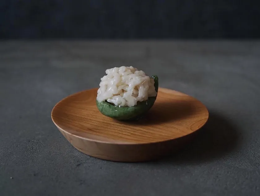 「引千切(ひちぎり)」には、最高級の備中白あんと薯蕷(じょうよ)あん、さらに、よもぎを混ぜたものを台座とし、その上に粒あん・きんとん生地をあしらっています。