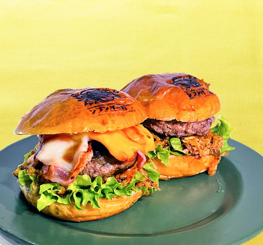 第12回全国和牛能力共進会(第8区)で最優秀枝肉賞を受賞した“うしの中山”で丹精込めて育てられた黒毛和牛を使用。黒毛和牛と黒豚の食べ比べができるミニバーガーセット。