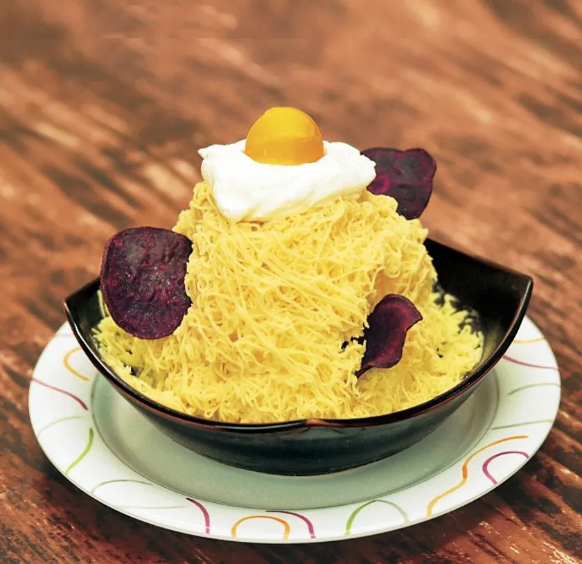 鹿児島県産さつま芋ペーストと紫芋チップスをトッピングしたモンブラン風かき氷。
