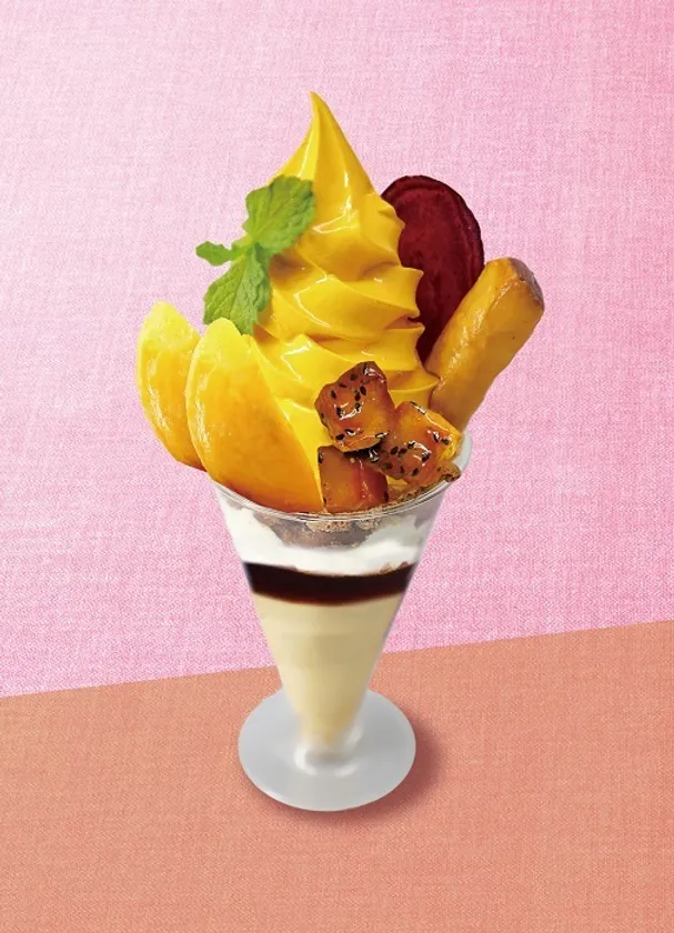 完熟紅はるかのプリンにソフトクリーム、スティック状の大学いもやスイートポテトがのった芋づくしのパフェ。