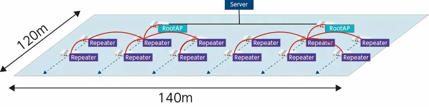 サイレックス独自のツリー型接続メッシュネットワーク「AMC Mesh機能」に対応しており、最大32台で1つのAMC Meshネットワークを構成することができます。本機能は、複数の経路候補から動的に経路を選択してネットワークを構成し、ホップを重ねることで広域な無線LANネットワークを形成します。下の図では、RootAP 2台、Repeater 30台で構成されるメッシュネットワークを想定しています。推奨されるホップ数は5ホップで、最大120m×140mの範囲をカバーすることが可能です。
