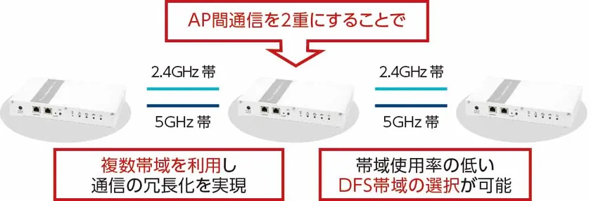 アクセスポイント間の通信を2.4GHzと5GHzの両方で同時に行うことで、5GHz帯の無線LANを使った業務運用で生じるW53やW56のDFS(Dynamic Frequency Selection)帯域を使用することができます。例えば、5GHz帯で通信中に気象レーダなどの検知があっても、2.4GHz帯をバックアップとして接続を維持することが可能です。その後、5GHz帯の通信が再開可能となり、次に使用する5GHz帯のチャネル情報を共有して、自動的に5GHz帯への通信に復帰します。