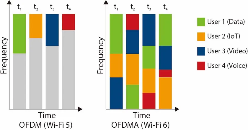 Wi-Fi 6の機能であるOFDMA、双方向のMU-MIMOに対応し、混雑環境でも安定した通信を実現します。OFDMA対応により、最大速度理論値の向上だけでなく、一つの時間単位内に複数ユーザのデータを入れ込むことが可能となり、密集/混雑環境でもストレスのない通信が可能です。