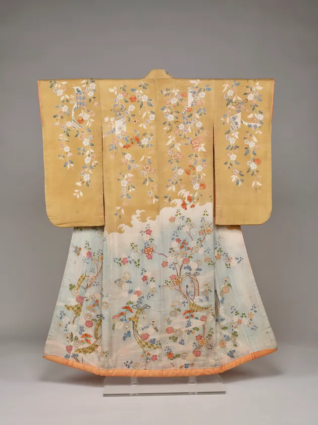 枝垂桜が肩にかかる模様を友禅染で表します。上下にわけるスタイルは江戸時代中期に流行しました。