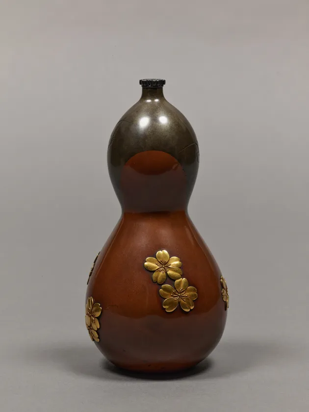 素銅(すあか)と銀・銅の合金を継ぎ合わせてつくられたお酒の容器です。上部には雲間にのぞく月を銀象嵌(ぎんぞうがん)し、下部に鍍金の桜花が嵌めこまれています。