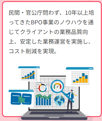 民間・官公庁問わず10年以上培ってきた業務委託(BPO)事業部の、業務切り出し・人材のスキルに合わせた割り振り・安定した構築と運用実績についての知見やノウハウを通じて、クライアントの業務品質向上、安定した業務運営を実施し、コスト削減を実現します。