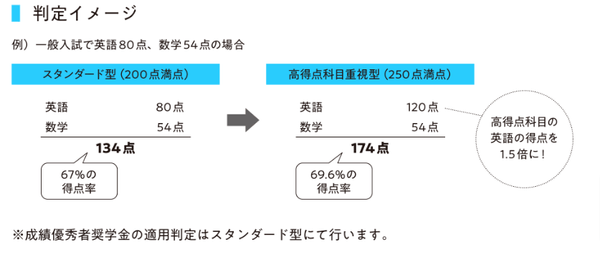 100点満点×2科目の合計200点満点で判定する「スタンダード型判定」と、高得点の科目を1.5倍に傾斜配点し、250点満点で判定する「高得点科目重視型判定」の自動W判定方式を実施。検定料の追加費用はかかりません。より得意な科目を活かせる判定で、合格のチャンスが広がります。