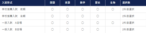 学校推薦入試 前期日程の受験科目は「国語」「英語」「歴史」「数学」「生物」の合計5科目。入学試験当日に問題冊子を見て、自由に選択できます。専願・併願選択制で、他大学との併願受験も可能。専願の場合には科目得点に10点加点の優遇措置があります。
