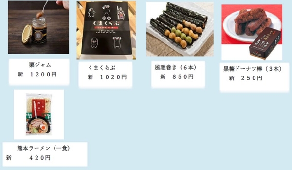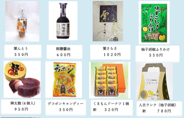 熊本県を代表する銘菓「陣太鼓」、人吉産の球磨川ゆず胡椒を使用した「人吉ラシク」、熊本県山江村産の栗100%を使った「栗ジャム」などを販売。