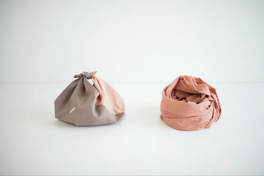 長方形の布を折って縫い合わせる吾妻袋は、日本の伝統的な形です。包む物を選ばず、持ち手を結ぶだけで簡単に使えます。草木染めの色を楽しめる2TONEカラーで作りました。お土産やギフトにも最適です。