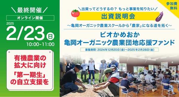 本ファンドは、農業団地の設備投資費の一部を投資で応援いただき、新規の有機農家を地域や社会全体で支え合う持続可能な農業の実現をめざします。2月23日には最終のファンド説明会を開催します。