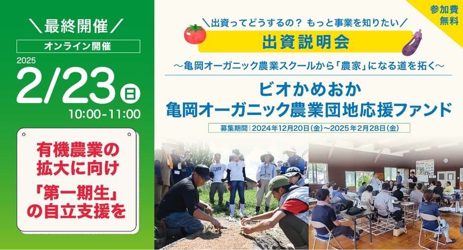 【2月23日オンライン出資説明会開催】有機農業を始める「第一期生」の自立支援を「亀岡オーガニック農業団地」で