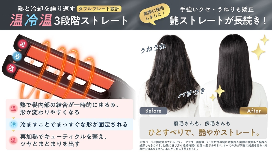 熱で髪内部の結合を一時的にゆるめ、冷却で形を固定する温冷ダブルプレート構造を採用。再加熱でキューティクルを整えながら仕上げることで、クセを芯から伸ばし、ワンストロークでも高いストレート力を実感できます。時間が経っても広がりにくく、朝の仕上がりが1日中続くため、外出先でも自信の持てる艶髪へ導きます。
