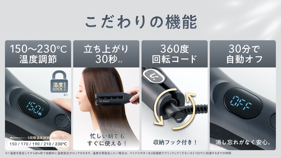 150〜230℃の5段階温度調節と見やすいLED表示を搭載し、髪質や仕上がりに合わせた最適なスタイリングが可能。30分自動オフや温度ロック機能も備え、忙しい朝や家族での共用でも安心して使えます。海外対応電圧で旅行先でもいつもの艶ストレートをキープ。毎日の使用でも操作に迷わず、ヘアアイロン初心者から上級者まで快適に使える設計です。長く愛用できます。