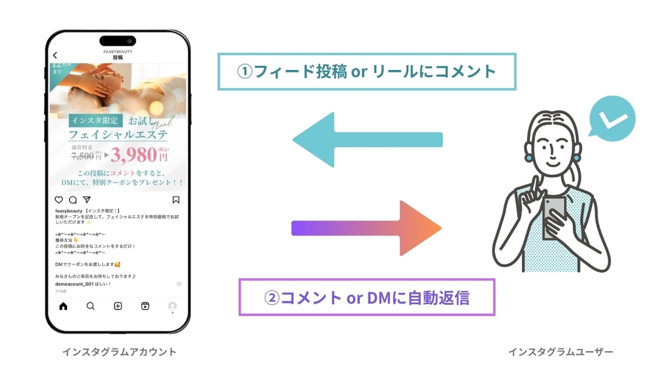 例えば、「サンプル希望」のコメントをくれたユーザーに対して、お申し込みのためのURLを添付したDMを自動送信できます。
