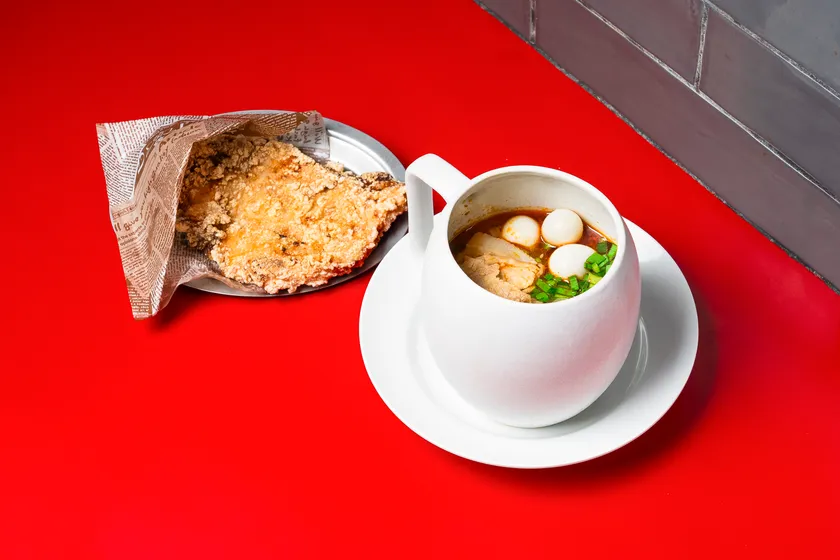 サクサクジューシーなダージーパイと、麻辣を使ったピリ辛スパイシーなスープは相性抜群。ライスヌードルにしたことで、揚げ物と合わせてもくどくない組み合わせに。