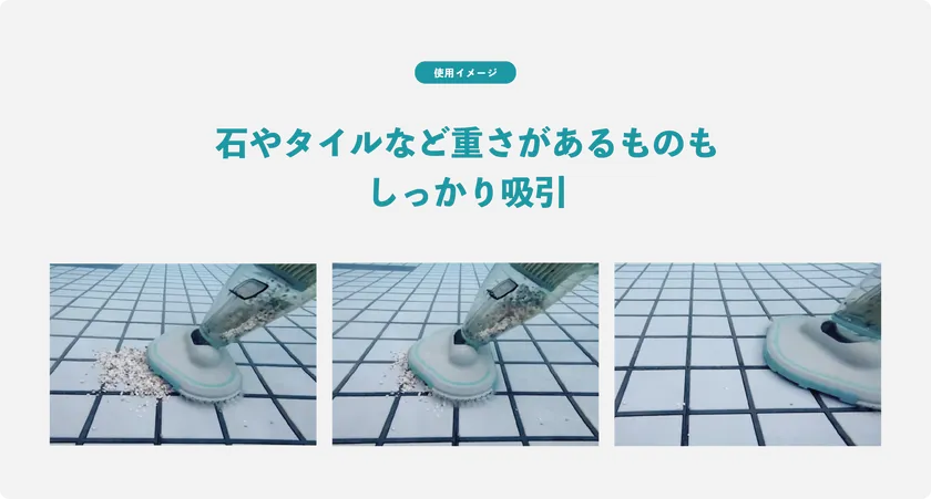■吸引力 120L/分:吸引力は120L/分で、60分の連続使用が可能です。固形物や割れたタイルなど重さがあるものもしっかり吸収してくれるのでストレスなくご使用いただけます。