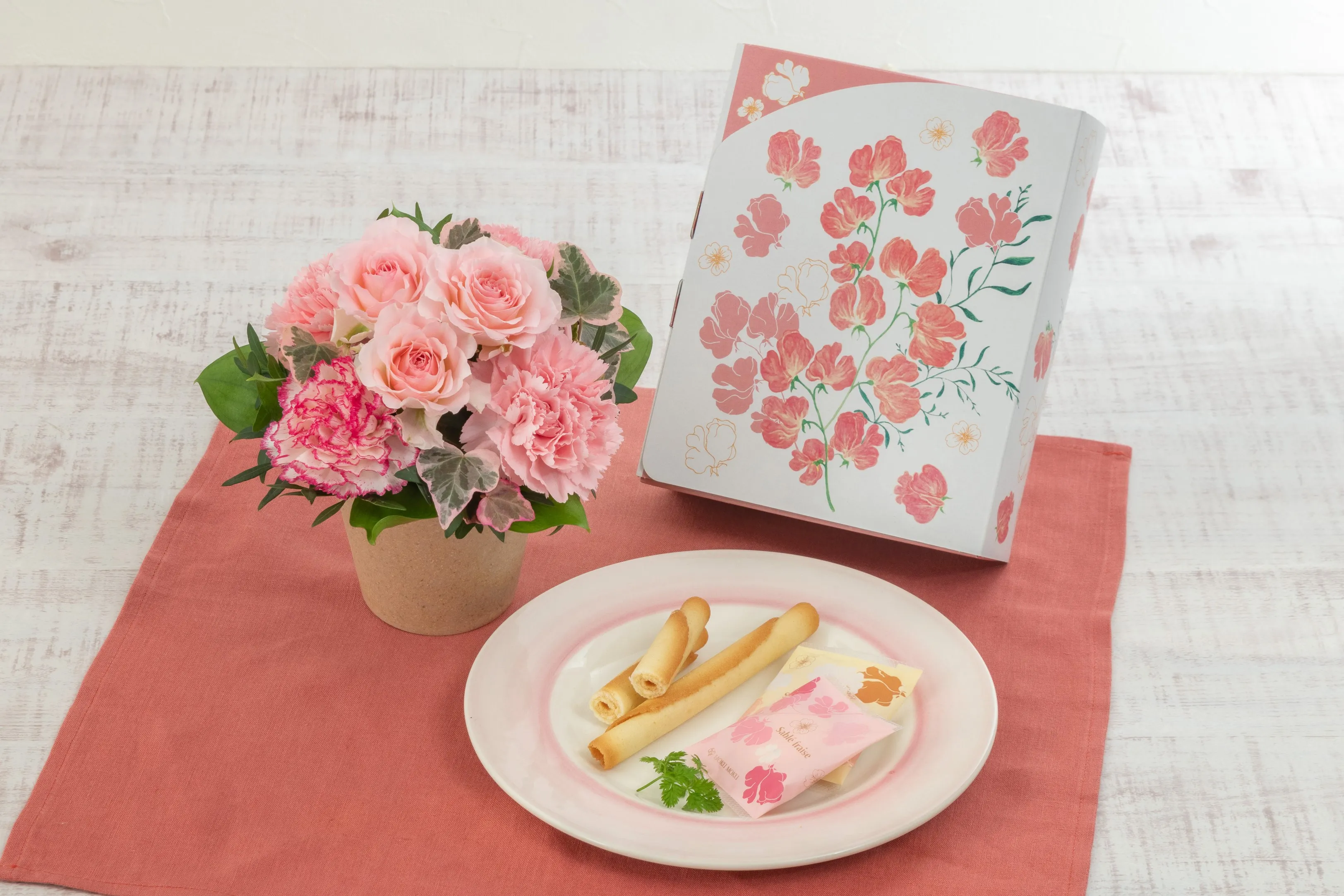 想いがたくさん詰まった春限定パッケージの「カドー ドゥ プランタン」を、バラやカーネーションをあしらったピンクグラデーションの優しい色合いのアレンジメントとともに、母の日期間にお届けします。