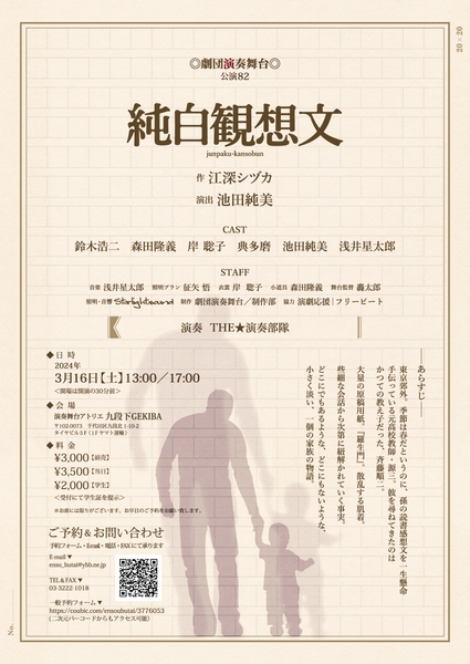 劇団演奏舞台 公演82『純白観想文』が2024年3月16日 (土)に演奏舞台アトリエ/九段下GEKIBA(東京都千代田区九段北1丁目10-2 タイヤビル5F)にて上演されます。