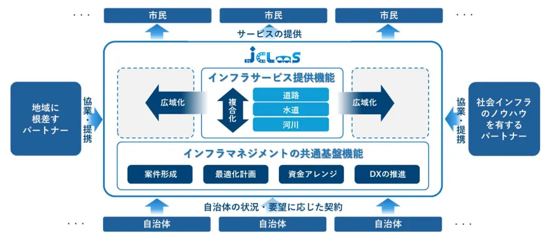 「JCLaaS」では、6社が社会インフラサービスのプラットフォーマーとして、「最適化の計画策定」「工事、保守の体制整備、履行」「資金アレンジ」に至るまで、社会インフラの最適化のために必要な機能を総合的に担い、自治体等の状況やご要望に応じたサービスを提供します。