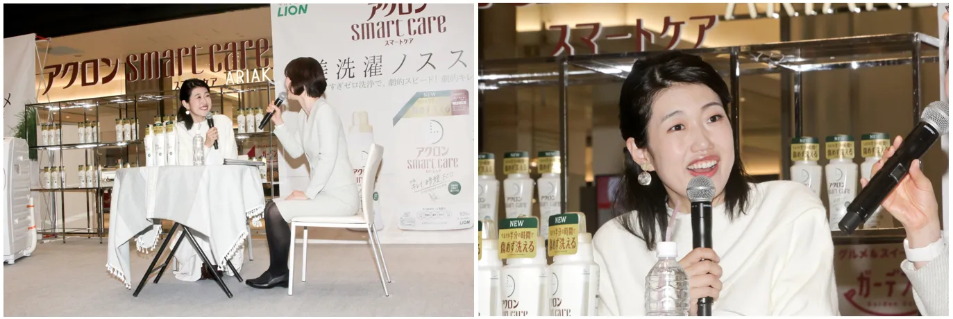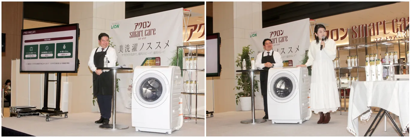 イベントには、お笑いタレントの横澤夏子さんが登壇。「美洗濯ノススメ」をテーマに、軽快なトークを繰り広げました。タレントとしてだけでなく、3児の母として、日々大忙しの横澤夏子さんが、洗濯にちなんだ洗い流したい過去や横澤流家事時短術に加え、バレンタインのエピソードなどについて語りました。イベントの後半には、実演販売士である中谷健太郎さんが、すすぎゼロを実現するおしゃれ着用洗剤『アクロンスマートケア』を使った「美洗濯」のコツや洗濯機の設定について解説。『アクロンスマートケア』を使えば洗濯時間が短縮できるということで、横澤さんは食い入るように話を聞いていました。