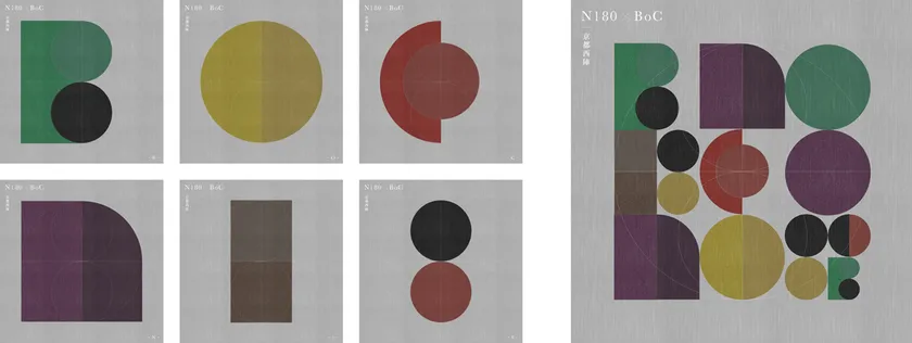 織物と対極にあるデジタル的な要素を織物にも表現できないかという着想から、西陣織の縦織や丸い糸の束を円と線で表現したタイポデザインを制作しました。当プロジェクト名である「Bank of Craft」と西陣織の職人チーム「N180」をマテリアルとし、ランダムにレイアウトした幾何学的なグラフィックとなっています。