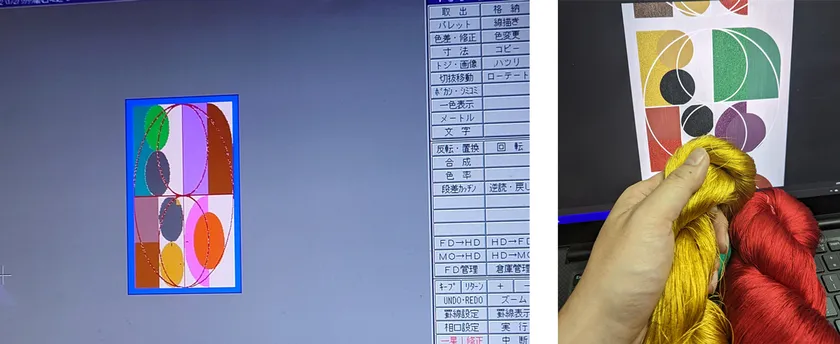織物を考案する過程(写真左はコンピュータで織物プログラム(紋紙)を制作、写真右は糸の色選び)