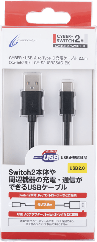 株式会社サイバーガジェット(本社:東京都千代田区)は、Nintendo Switch 2用アクセサリーの新製品として、『CYBER・USB-A to Type-C充電ケーブル 2.5m(Switch2用)』と『CYBER・USB Type-C to C充電ケーブル 2.5m(Switch2用)』の2製品を2026年1月22日(木)に発売いたします。