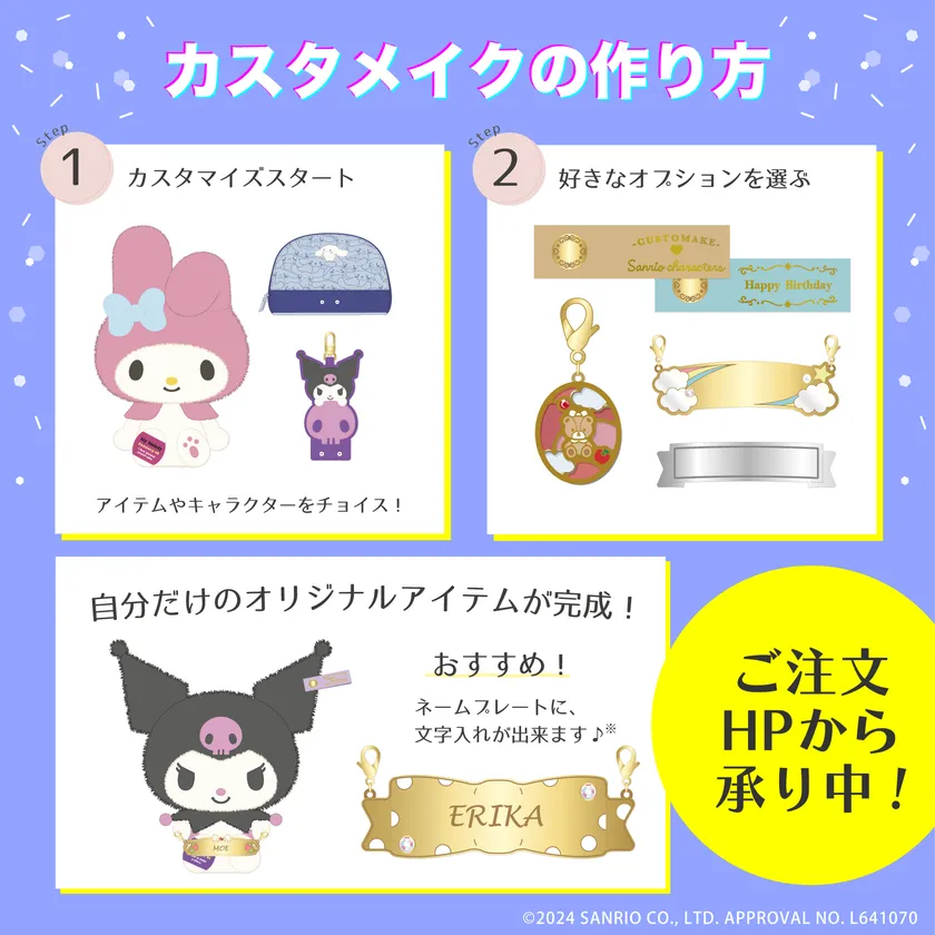 Customake(カスタメイク)は、お気に入りのキャラクターのアイテムをカスタマイズして、世界で一つのオリジナルアイテムを作ることができるキャラクターカスタマイズショップです。お気に入りのキャラクターのぬいぐるみやポーチ、キーホルダーを、あなたの思いのままにカスタマイズできます。方法はとってもカンタンです。まずは、サイトにアクセス!
