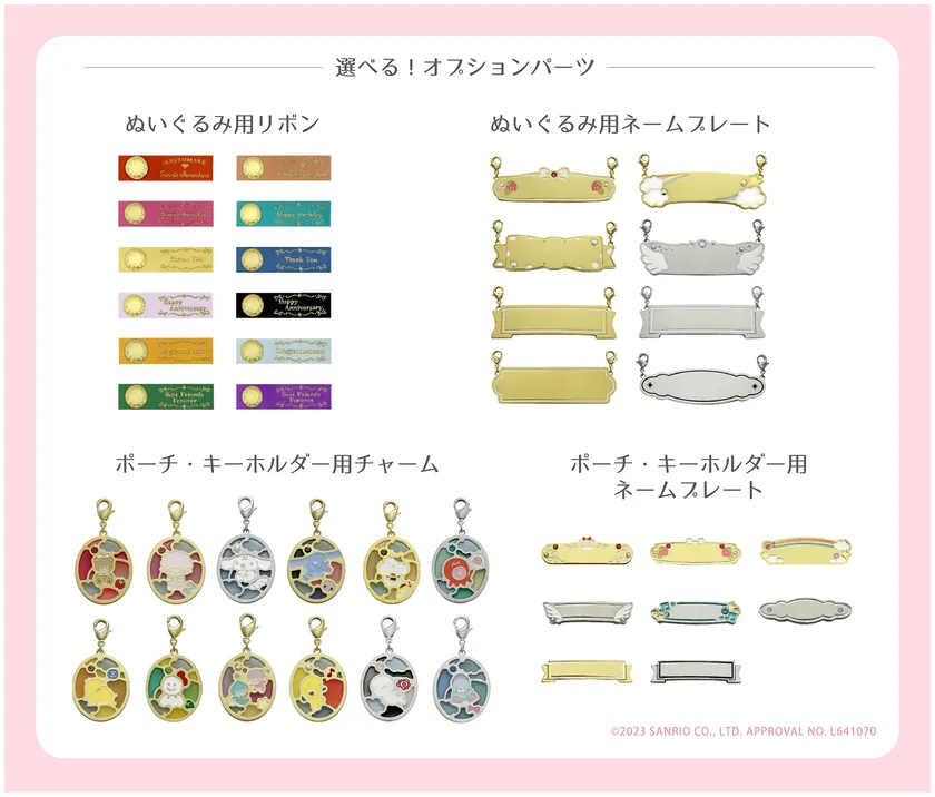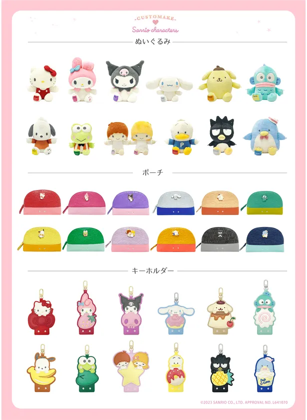 ぬいぐるみ、ポーチ、キーホルダーの中からお気に入りのアイテムをセレクト。キャラクターラインナップは全12種類。ここでしか出会えない、株式会社サンリオのキャラクターたちのオリジナルデザインを見つけましょう。