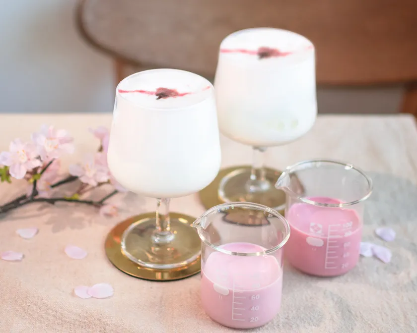 ドリンクメニューはさくら味の濃さを選ぶことができる「濃厚自家製さくらオレ」と「自家製さくらオレ」の2種類を販売いたします。自家製のさくらベースを注ぐと、綺麗な2層に仕上がり、さくらのテリーヌショコラ ~チーズクリーム~と一緒に撮ることで満開の桜スイーツを楽しむことができます。