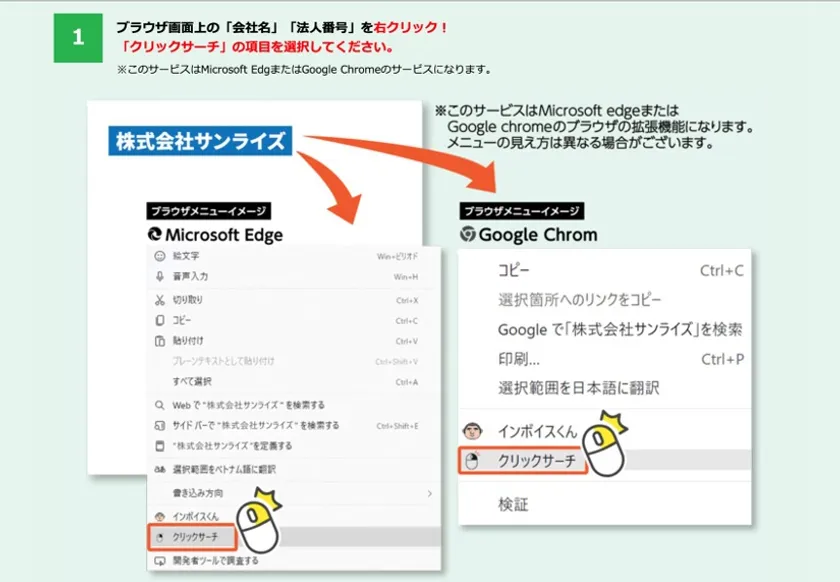 ●Microsoft Edge/Google Chromeブラウザの拡張機能を使用するため、新たなソフトの導入や起動は一切不要。該当の会社名や法人番号などの情報を選択して右クリックして表示される項目から「クリックサーチ」の項目を選択するだけで企業情報が表示されます。