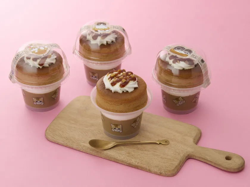 【内容】なめらかなくちどけのコーヒープリンとスッキリとした味わいのホイップクリーム&カラメル、ふわシュワ食感のキャラメルスフレ上にはクリーム・キャラメルソース・アーモンドをトッピングしました。ラベルとカップは「mofusand」とコラボレーションしたデザインで、全3種類です。※数量限定