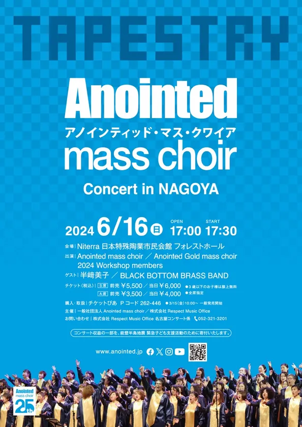全国にグループを持つゴスペルグループ「一般社団法人 Anointed mass choir(アノインティッド・マス・クワイア)」は、2023年6月で創立25周年を迎えました。創立の地、名古屋でコンサート「Anointed mass choir concert in NAGOYA“TAPESTRY”」とワークショップ「GOSPEL WORKSHOP 2024」を開催します。